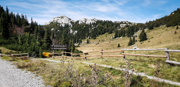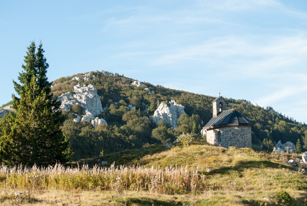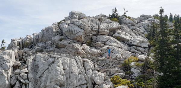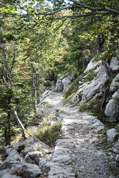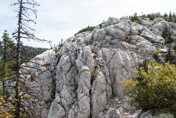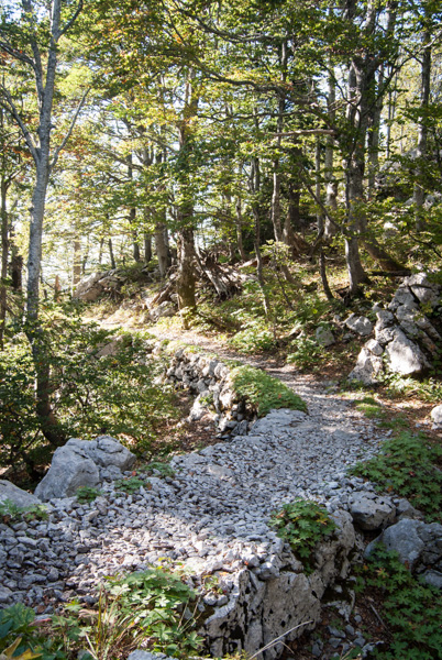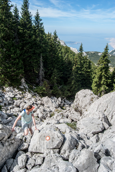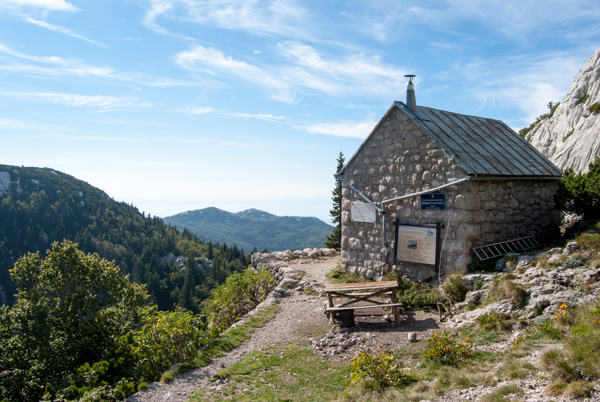 We then joined the Premuzic Trail, laid out constructed in the 1930’s by the engineer Ante Premuzic. The trail is constructed using local rock and a drystone technique, and is considered a masterpiece of trail-building. It is mostly level, with the aim to allow easy access to remote parts of the Velebit Mountain range without any steep ascents or descents. In total, it is 57km long, however we had limited time. We walked to Rossi’s shelter, an inviting mountain hut as our turn-around point, all the while enjoying the interesting landscape of white limestone, green conifers with deep sinkholes on either side of the ridge.