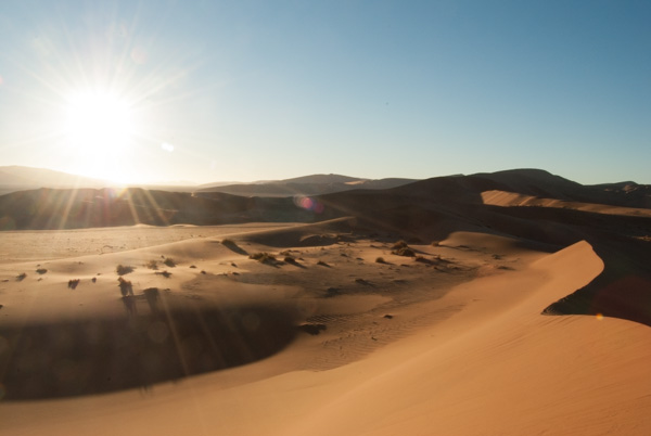 Always up for a summit, we decided to climb the adjacent dune “Big Daddy”. It was only about 9:30am but the sun was already baking and the sand was soft. Like the proverbial frog in the well, we slid back down again with every step up, making hot and tiring work. We finally got to the peak and enjoyed spectacular 360 degree views over the surrounding desert dunes. We then ran back down the dune, which was considerably quicker and more fun than the hike up!