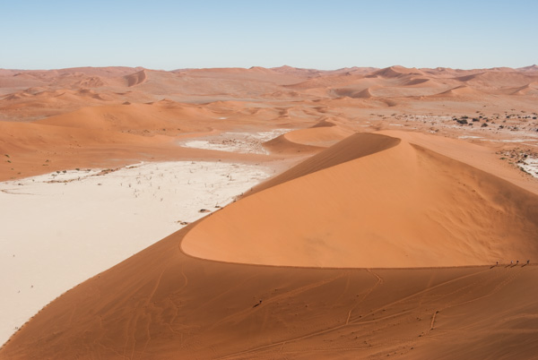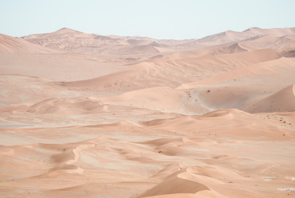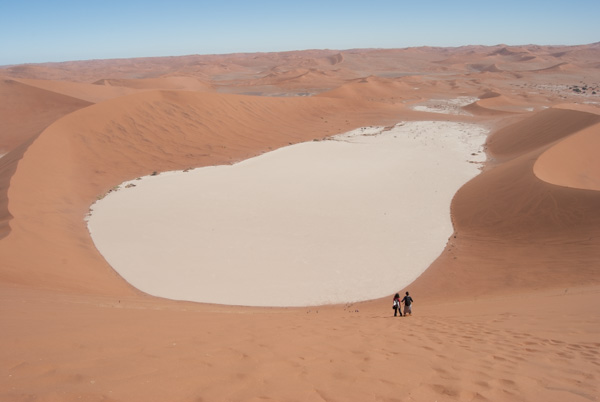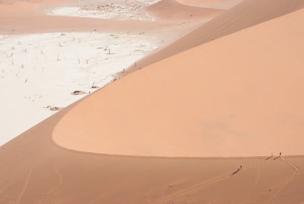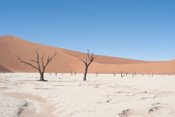 We arrived back at the parking lot to find it had filled up considerably, and a shuttle service was now offering lifts through the sand to Sossusvlei. We hopped on, and after a short drive and a hot walk, we laid eyes on the spectacular Deadvlei. The white clay pan is starkly contrasted by dark dead trees, and the surrounding orange dunes. And people everywhere, all trying to get a photo without any other people in it.